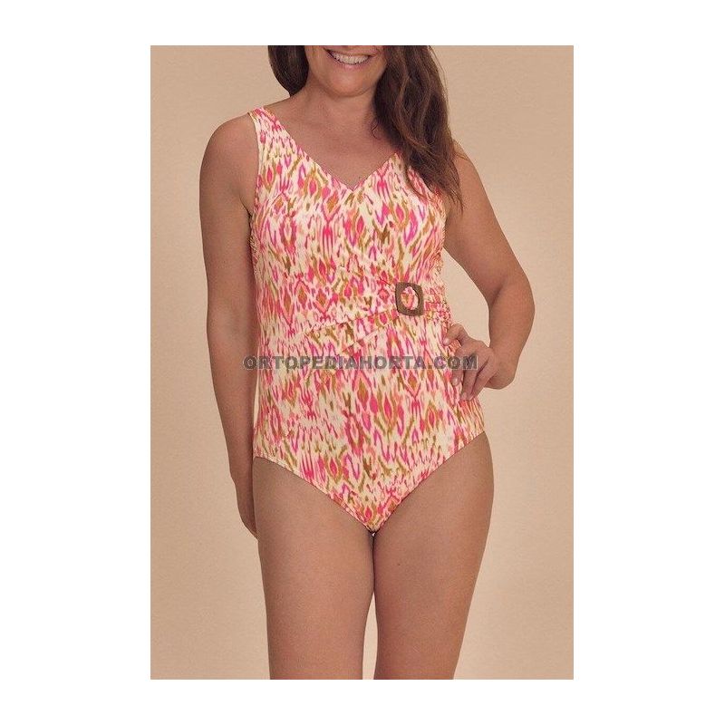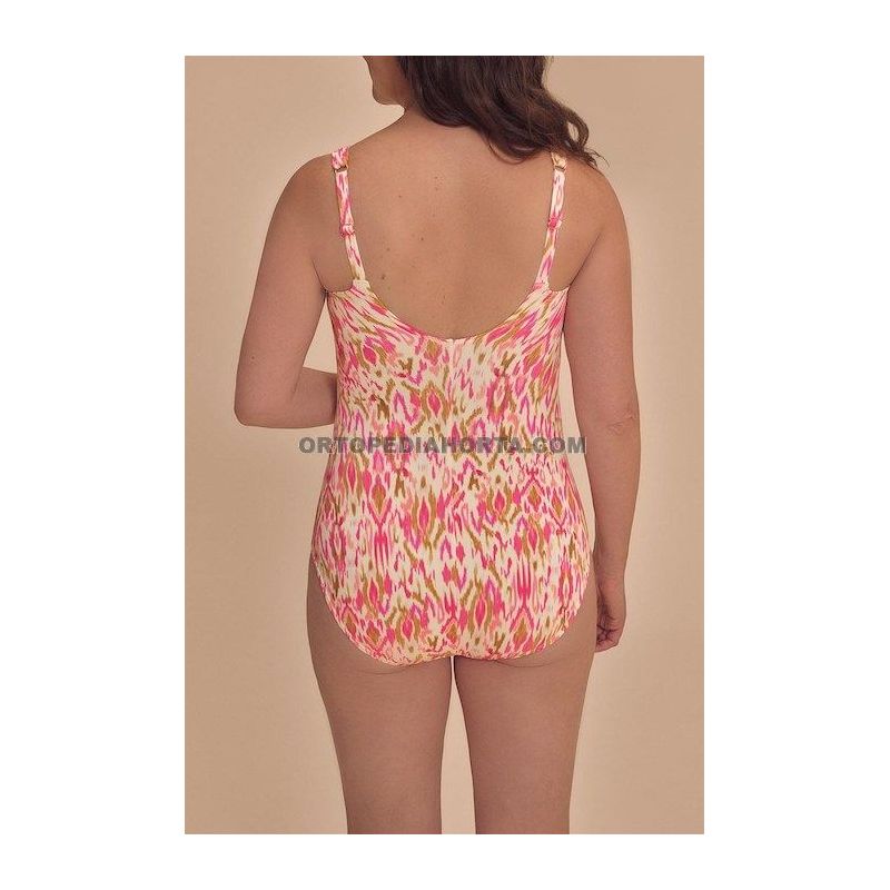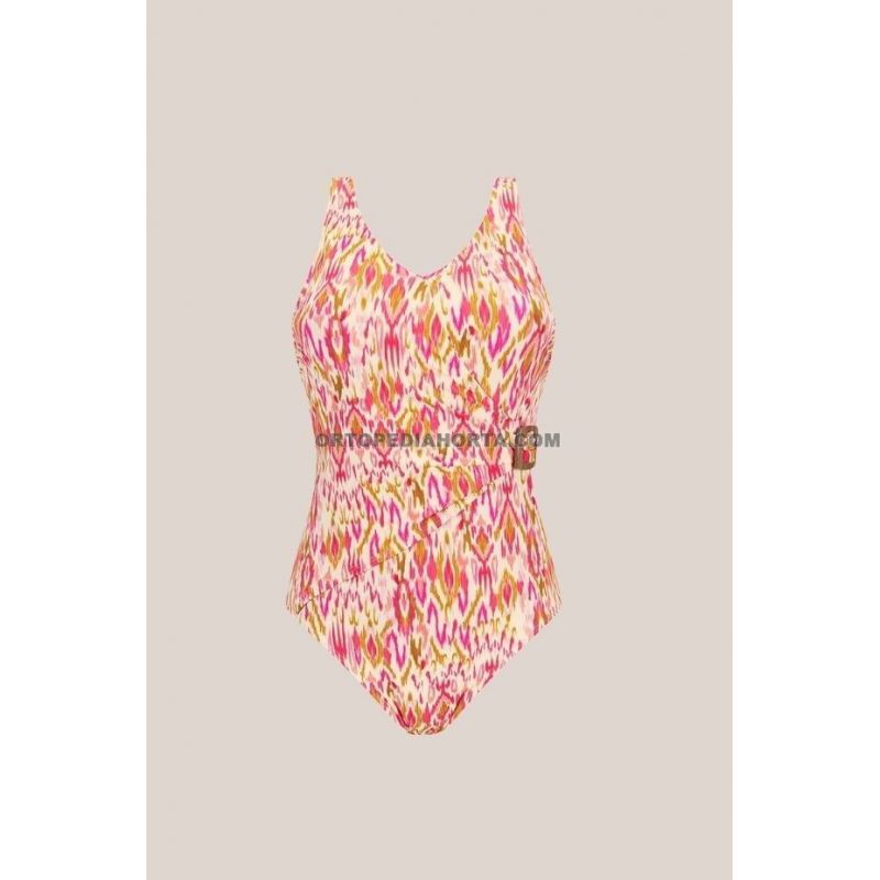 Su elegante estampado de inspiración Ikat en cálidos tonos rosas y tierra (grapefruit/multi) aporta un toque femenino y moderno, demostrando que la moda de baño adaptada puede ser tan sofisticada como funcional. Este modelo de medio forro está diseñado para realzar la silueta mientras ofrece una discreción absoluta para mujeres que han pasado por una cirugía de mama.